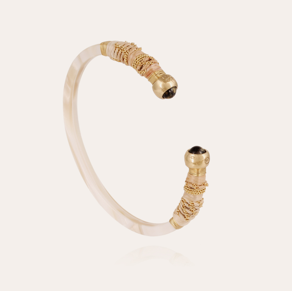 Fine acetate bangle bracelet wrapped in colored threads and golden wire. This bracelet is ended by two gold plated balls.